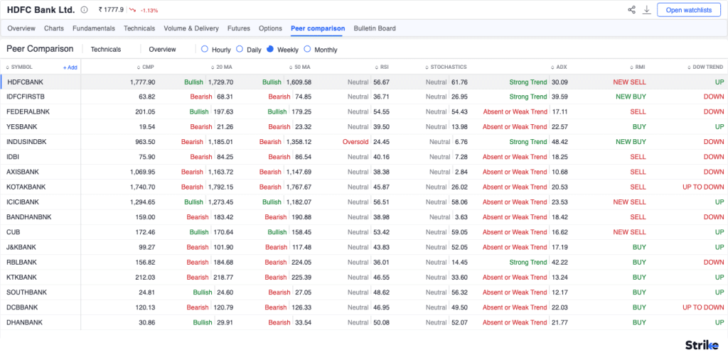 HDFC Bank has maintained a bullish trend on 20 and 50-day moving averages on its weekly time frame. At the same time, RSI and stochastic indicators, which are momentum oscillators, also suggest neutral characteristics. HDFC Bank is the only bank that is showing ‘Strong Trend’ readings on the ADX indicator. Except for RMI, even the Dow Trend indicator is showing an ‘UP’ move.